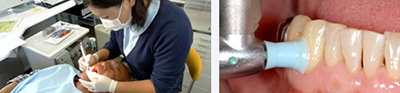 毎日の歯磨きで磨き残してしまった部分や歯ブラシが届かない歯周ポケット(歯と歯茎の間の溝)内の歯の根の部分もきれいに磨いて汚れを取り除きます。歯石を削り取るような治療ではないため、痛みを感じない低刺激の範囲で行なわれます。